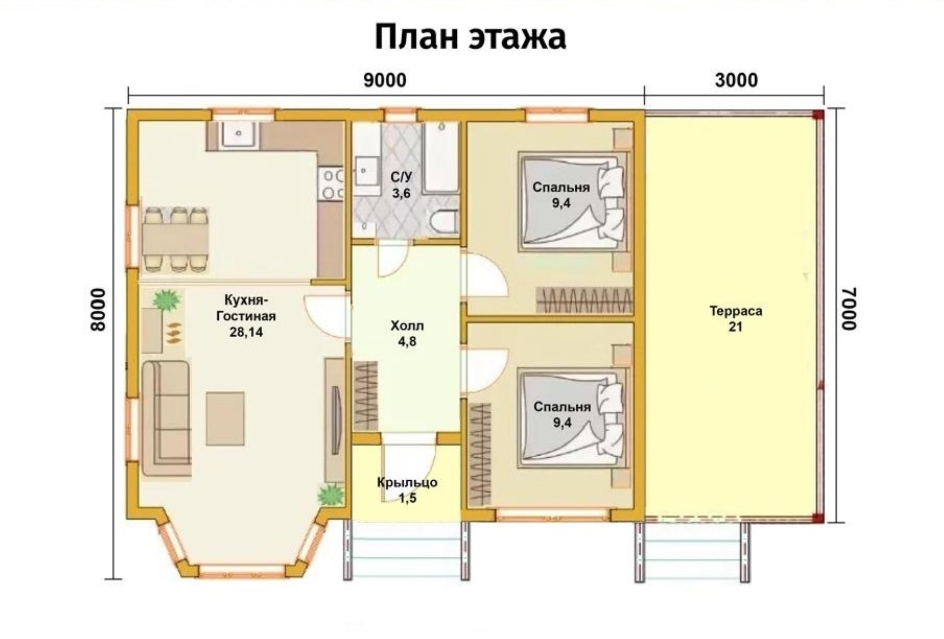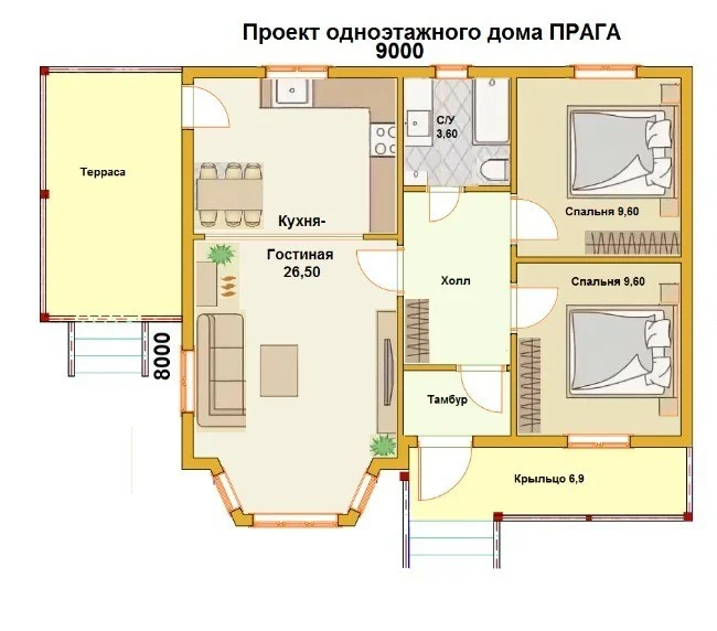 Дом одноэтажный каркасный Прага-1 72м2 с террасой 15м2