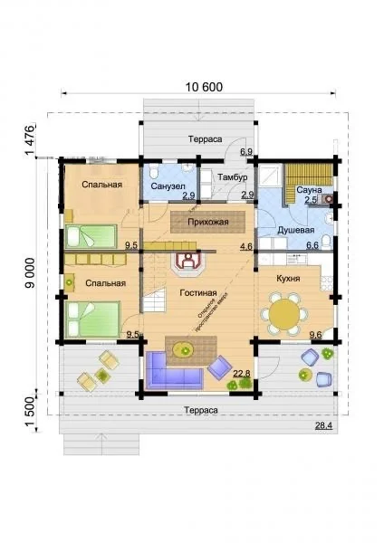 Сауна-душевая: 9,1 м2.